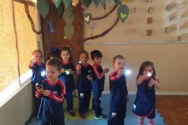Para trabalhar as diferenças entre Dia e Noite, Claro e escuro, a turma do Pinguinho descobriu como é ler um livro e observar no escuro.