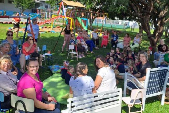 Galeria 1 do material Girolhar, com a presença das avós das crianças do Infantil II e a produção de fuxicos de crochê.