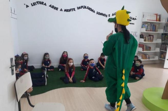A biblioteca Laura Vicuña, através da colaboradora, professora Jaqueline, iniciou o projeto hora do conto para as turmas do infantil e fundamental.